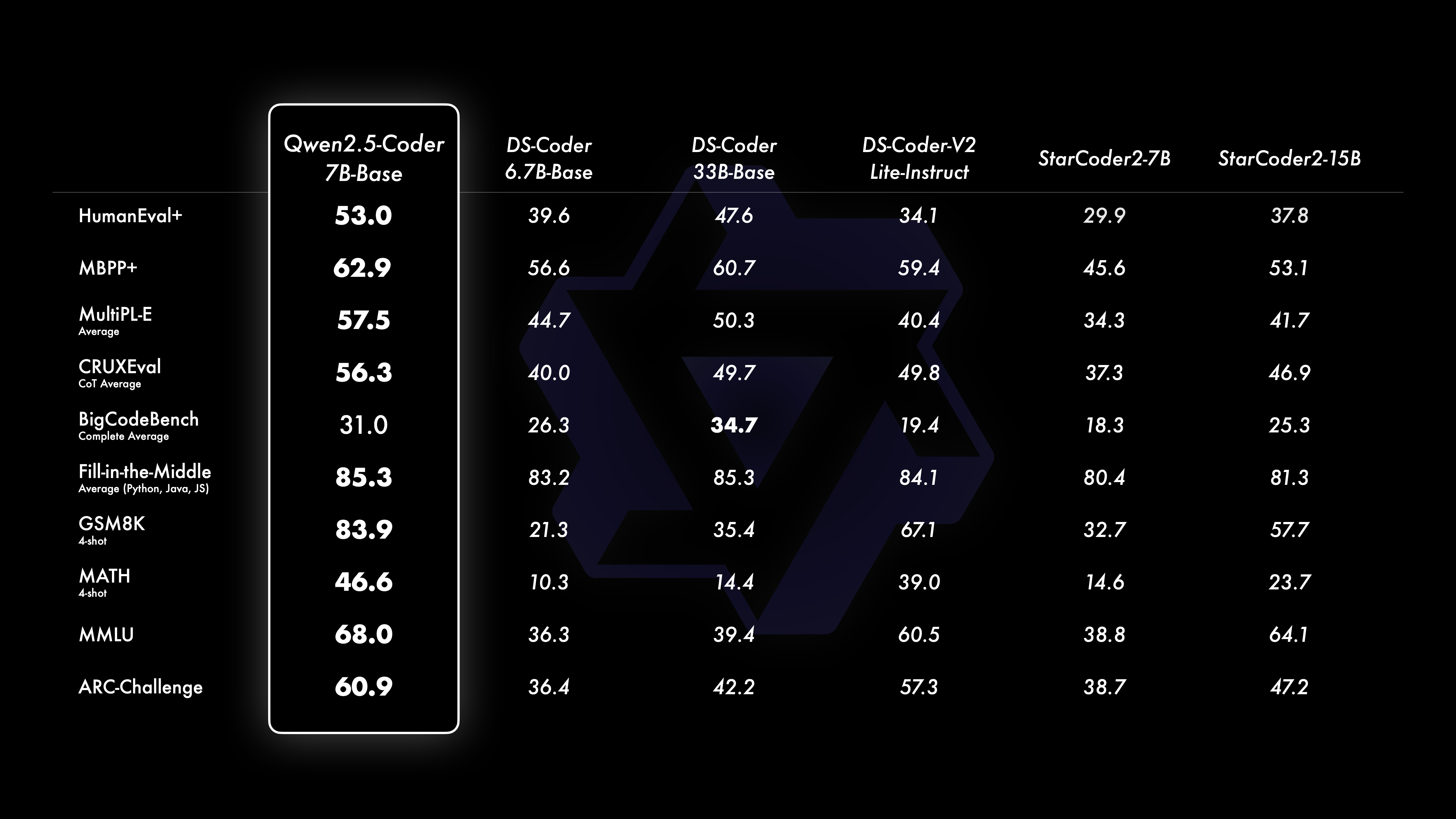 | Qwen2.5-Coder-7B-Base (official) | N/A | 63.75 | 22.95 | 34.2 | 70.36 | 25.25 | 21.72 |